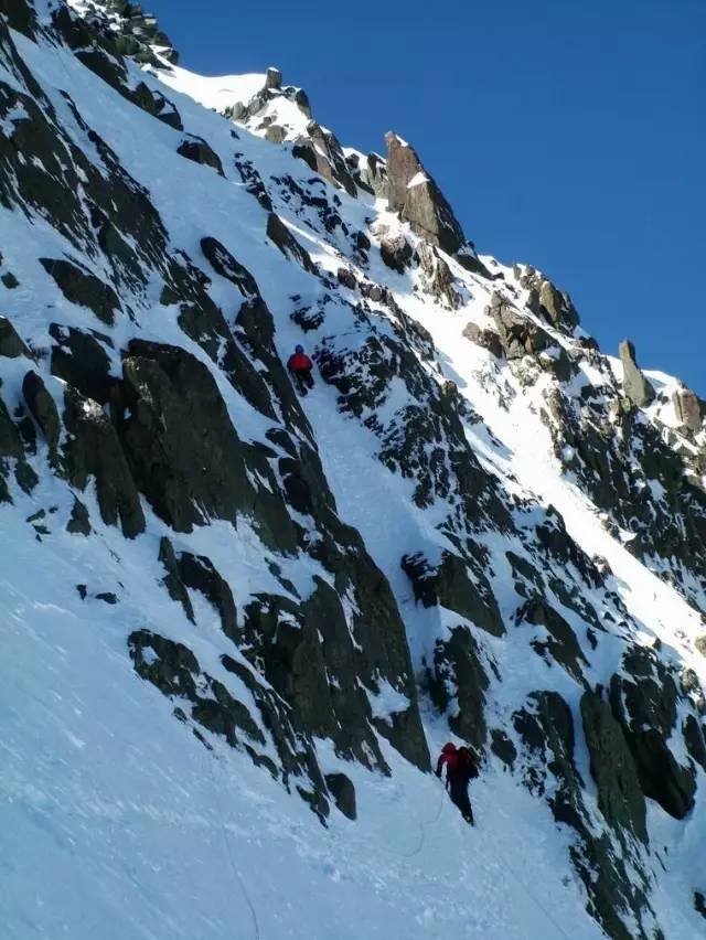 为了节省时间,我俩也没有结组,肩并肩地攀冰而上,2个小时后到达了冰岩混合地带。此时坡度急剧加大,岩石上还覆盖了一层薄冰,我俩只得放慢了速度,开始用交替保护的方式往上攀登。