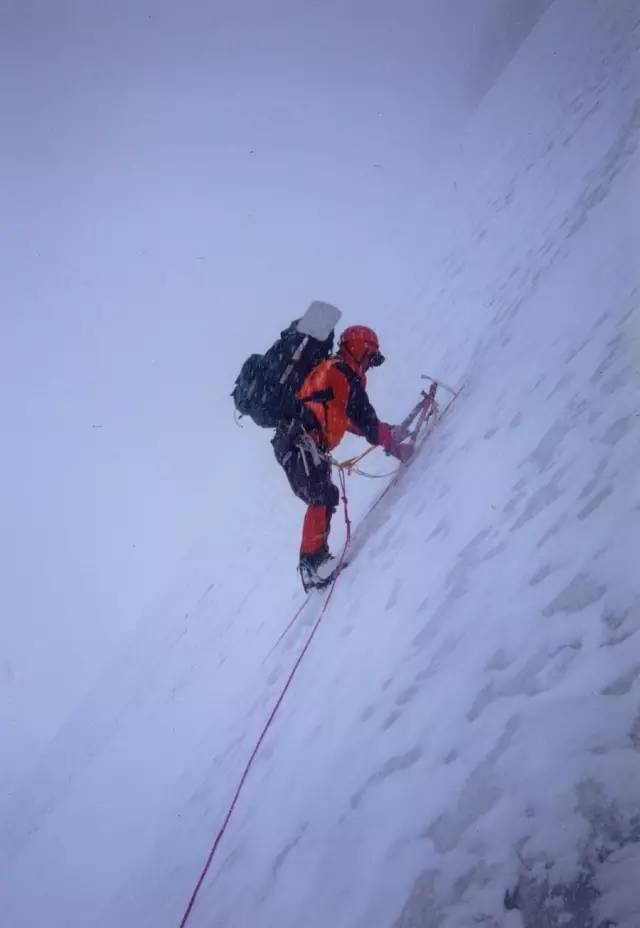 接近5080米时,横在我们面前的是一个垂直的大雪檐。此时,冰爪也失去了作用,松软的雪墙无法攀登,我俩只好用冰镐刨出了一个斜槽,春风脱去了冰爪,踩着我的肩膀奋力爬了上去。