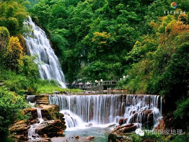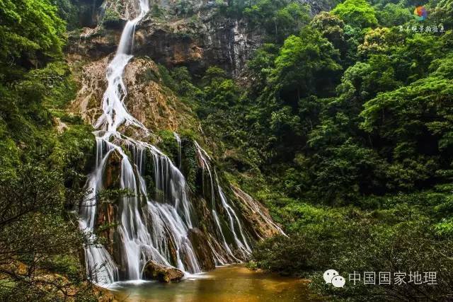 有的瀑布好似一条条银链从悬崖峭壁上直泻而下,比如说拉灯瀑布。它的名字比较奇怪吧,因解放前一农户为抗地主债务躲避于此,后被捉去得名“拿得”,后演化为拉灯。亲临这里就可以看到好似一条条银链似的瀑布,瀑底瀑声涛涛,水雾迷茫,天然氧气充足,遇天气晴朗时彩虹浪漫,河流两岸水成岩迹象明显。因河水多流经森林密布地区,水中多沉腐树叶,潭水呈茶色。