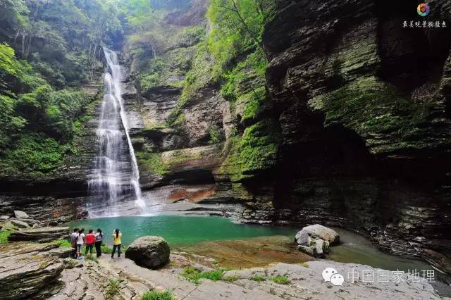 还有的瀑布兼具两种风格,比如说端公潭瀑布。一半阳刚,一半婉约。瀑布距离七里峡入口1公里,瀑布落差约20米。瀑布从山崖藤蔓缠绕中冲下,直落深潭。潭中水深、清、寒,全为布满绿苔的石头,近岸的卷石底冒出,为屿为坻,为堪为岩,条条石纹清晰可辨。