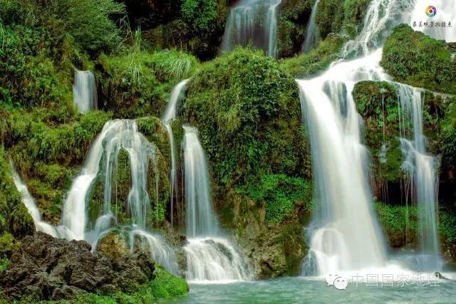 还有的瀑布可以呈现各式各样的水形图案,比如甲茶瀑布。沿倾角约600的陡坡撒落,其上挂满形态各异的、金黄色的石灰华,导致岩面凸凹不平,形成多处迭坎,瀑布因之呈现出鱼鳞状、凤尾状、交叉状、辫状等各式各样的水形图案。