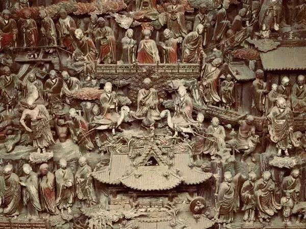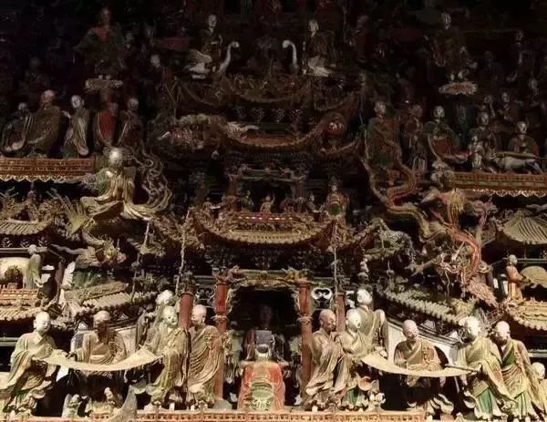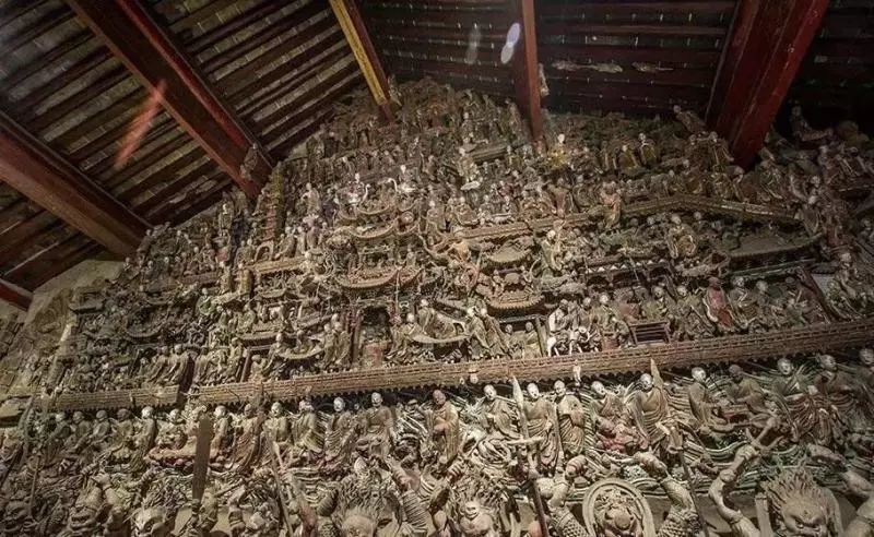 壁塑群把绘画、圆雕、浮雕、楼刻艺术手段容为一体,在墙、梁、柱上镶满了三千七百多尊人物及自然界万物的塑像,被喻为“壁塑瑰宝”。