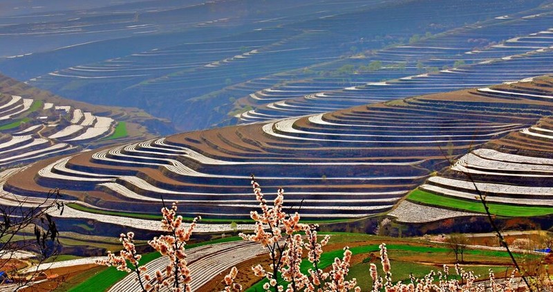于是,寻花途中便将镜头对准了那些或绵延到天际、或断续于深壑的旱作梯田,不仅为灵动的线条所魅,更深深体会到劳动创造美的真谛。