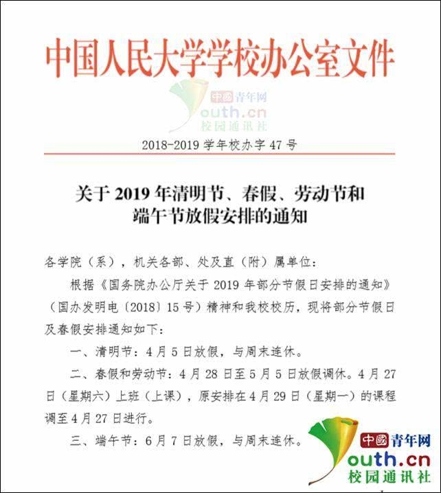 中国人民大学校办3月15日发布的《关于安排2019年清明节、春节、劳动节、端午节放假的通知》中,要求春假、劳动节放假时间为4月28日至5月5日。4月27日星期六,我去上班(上课),原计划是4月29日星期一到4月27日。教务处会根据实际情况安排课程调整及相关工作,不会缩短上课时间。