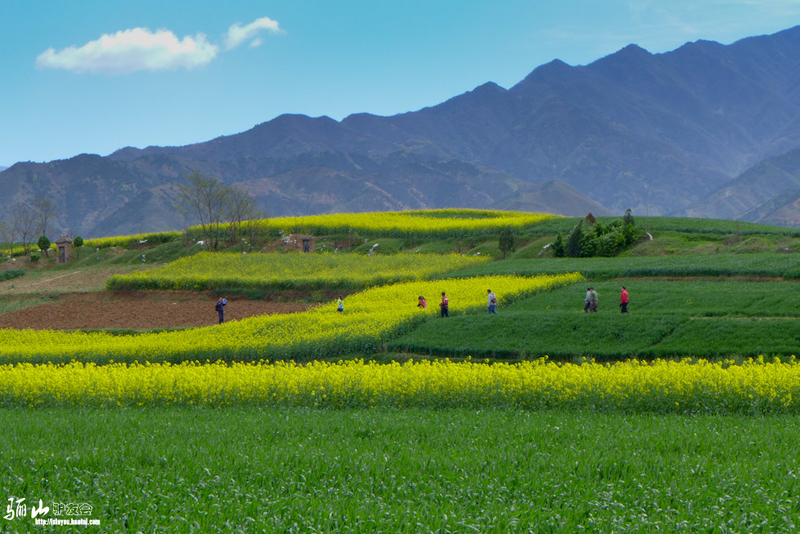 特色:这里的油菜花和麦子是间隔着播种的,开花后,很像大块的拼图。