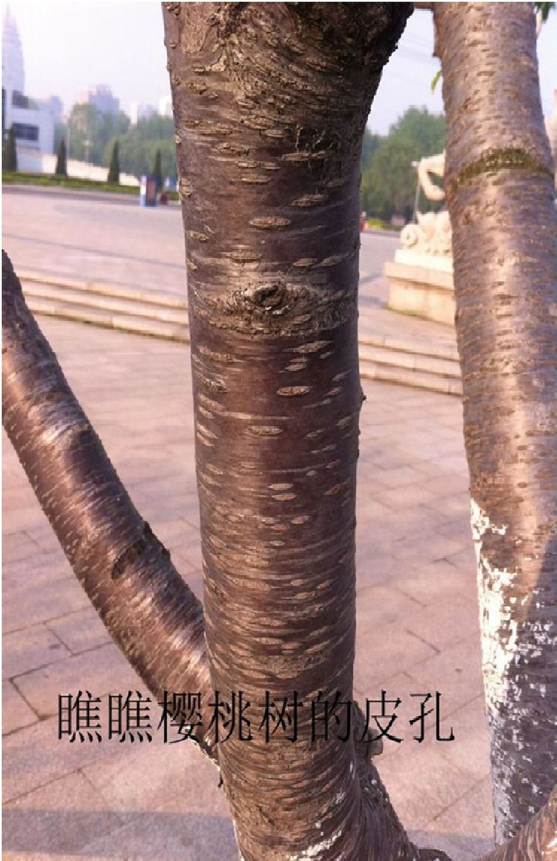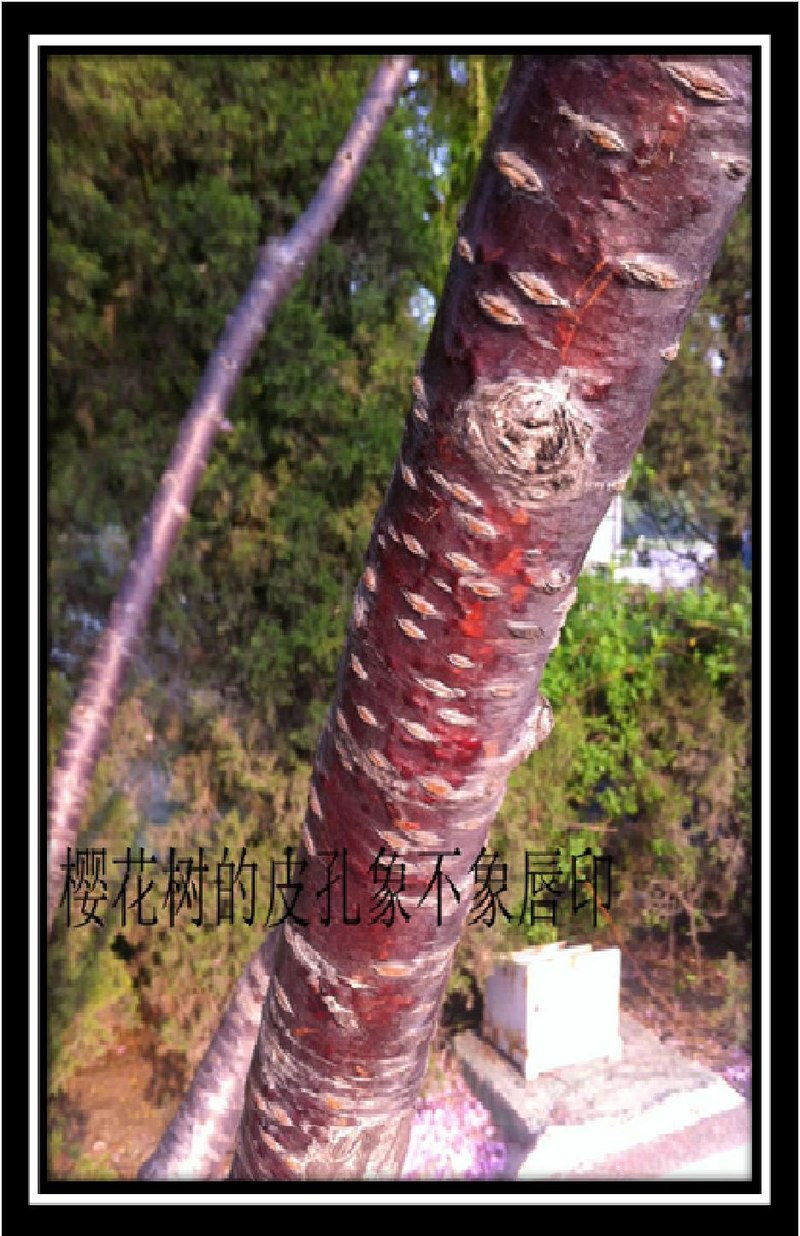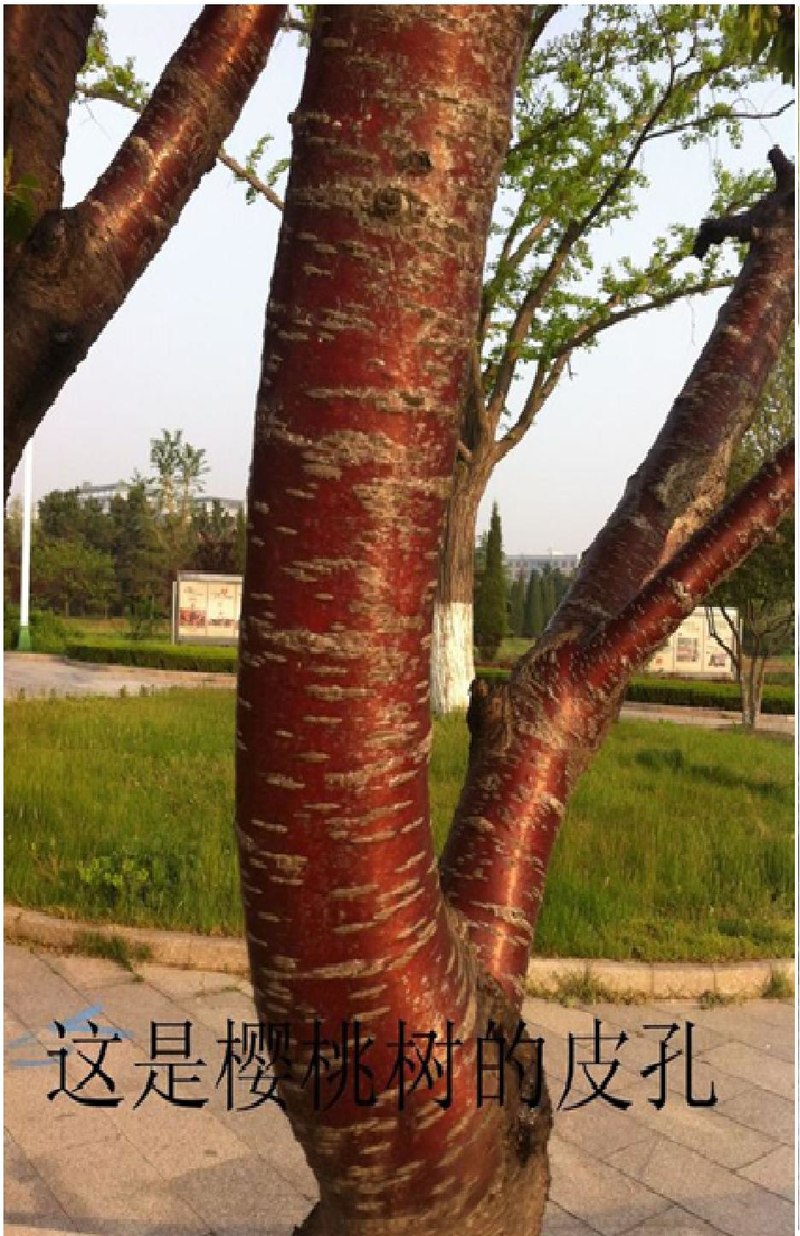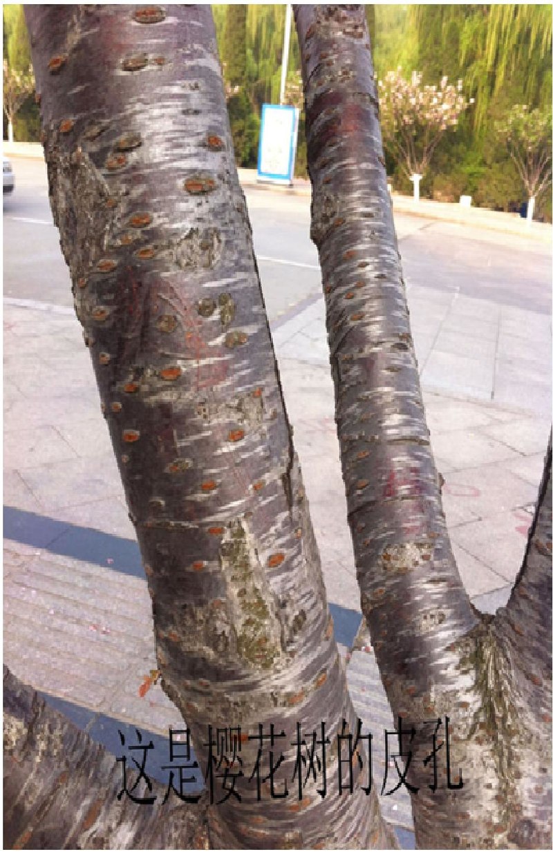 樱花的树皮是暗灰色的,具有明显的横纹及棕红色皮孔,树叶是嫩绿色的,颜色较鲜亮。