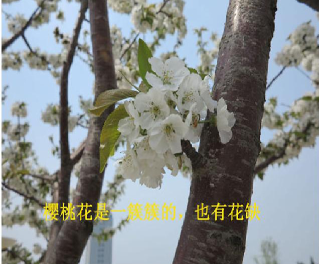 樱桃或樱,又名楔荆桃、车厘子等,是某些李属的植物的统称,包括樱桃亚属(Lithocerasus)、酸樱桃亚属(Cerasus)、桂樱亚属(Laurocerasus)等。果实可以作为水果食用,色泽鲜艳、晶莹美丽、红如玛瑙,黄如凝脂,营养特别丰富,果实富含糖、蛋白质、维生素及钙、铁、磷、钾等多种元素。樱桃花与樱花到底有啥区别:第一,樱花树干上的皮孔突起明显,好似是抹了口红的唇印;樱桃树干的皮孔尽管与樱花树皮孔很相似,但较平,不突出,“口红”不明显。第二,樱花树树叶边缘有象麦芒样的芒齿,樱桃树树叶没有。第三,樱花盛开时,萼片不反转;樱桃花盛开时,萼片是反折过来。第四,樱花花梗较长,樱桃花是一簇簇的,有一个木花柄(总花柄),上面密密麻麻的多个小花柄,每个小花柄上才有若干个带梗的花。另外,需要说明的,樱花花瓣尖上有缺口,樱桃花花瓣上也有缺口,凭花瓣上是否有民缺口来判断是错误的。