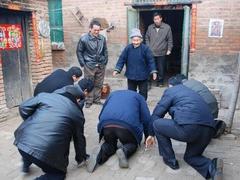除夕夜,照例是不能早睡的,因为要“守岁”。现在有电视,可以看春节晚会,不管它有多烂,总是有个打发时间的营生啊。不知道以前的人们守岁都干什么。大年初一,零时一过,天地间就是此起彼伏的鞭炮声了,空气里弥漫着火药的香味,可以好几天不散。一般的人家都是凌晨四五点起来,放鞭炮,吃饺子,这叫“起五更”。然后最重要的工作就是上坟。作为家中的长子,这是我每年必做的功课,还要在坟头规规矩矩给未见过面的奶奶磕上几个头。大年初一天稍微放亮,就要出去拜年了。我们那里拜年也有很多讲究,一般是血缘关系较近的组成一个小分队,要把全村家里有长辈或老人的人家都拜个遍。这个时候,哪怕两家平时有仇,打破头,也要捐弃前嫌,到对方家里拜年。以前拜年,据说是要真磕头的,不过现在改良了,多数情况下只用动嘴不用动腿了。一般的步骤是:一队人鱼贯进入一家,年长的在最前面带队,见到这家的老人就说:“大爷(大娘),拜个年吧”,主家照例要客气一番