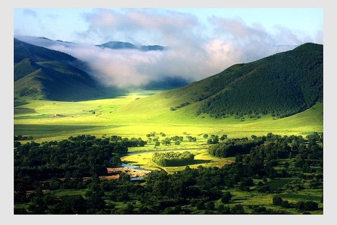 美丽的呼伦贝尔的一个个坡,一个个谷都是柔和的,舒缓的,那硕大的一望无际草原永远是那样的恢弘、恬静。呼伦贝尔的陈巴尔草原上的莫尔格勒河被当地人称为“第一曲水”,此地是以游牧部落为景观的旅游景点。