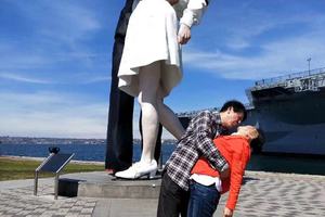 1945年8月的一天,纽约时报广场。当听到二战胜利结束的消息,一个年轻的水兵情不自禁地拉住过路的女护士狂吻了起来,这动人的一幕恰好被记者拍下,并广为流传。这是人类战胜法西斯后狂喜之情的宣泄,具有划时代的意义。