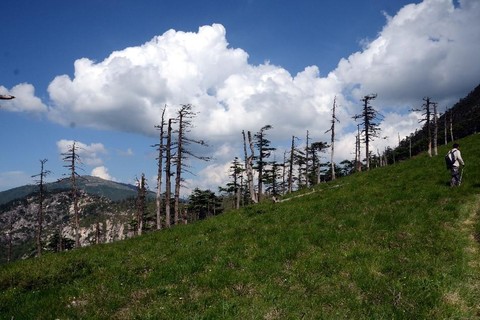 鹿角梁:鹿角梁位于秦岭腹地分水岭西南,海拔2700米,是牛背梁保护区西段的一段山梁,因形似鹿角而得名,也是长安区、宁陕县的分界线,高冠河的源头所在地,人迹罕至,植被原始,冷杉林风骨峥嵘,大草甸山花烂漫。是至今保存最为完好的一方净土。鹿角梁山势险峻,南坡皆为悬崖深谷,纵览群山险峻壮观,山高云闲风劲。梁上草甸广阔,花草丰茂,沿山梁渐次登高。穿过五个垭口,走过莽莽数个草垫,穿行于参天林木,每到一个制高点极目远眺,冰晶顶,光头山尽收眼底。南北群峰更是炙手可得,感受激情澎湃豪情万丈。