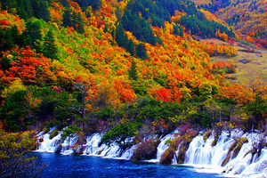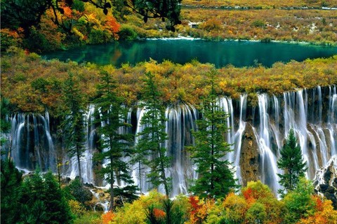 九寨沟的精华在于水,五花海被称为“九寨沟一绝”,同一片水中呈现鹅黄、墨绿、深蓝、藏青等颜色,在阳光照耀下更是绚丽多姿,令人眼花缭乱。如果您来到诺日朗大瀑布,算得上走近九寨沟美丽景色的中心了。高20余米、宽300余米的滚滚瀑布翻越海拔2365米的大堤飞泻而下,千万颗水珠织成一道宽银幕呈现在眼前——不论从哪个角度观赏,诺日朗同样动人心魄!