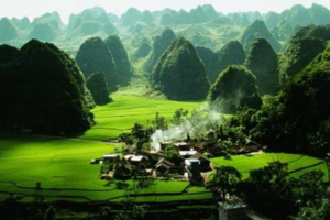 世外桃源景区核心的坝美村座落于一个三角形坝子中,青山环绕,从出水洞村进入坝美,或从汤那进入坝美村,均须乘船穿过幽长的水洞方可入村。穿过水洞,突见地势豁然开朗,形成别有洞天的优美环境。一条河流由南向北顺山谷纵贯狭长的谷地,其间耸立着笔直的猴爬岩,河水破岩穿行,河谷空旷处散布着耕田块块。山坡上,古榕翠竹间坐落着一个壮乡村寨,村民沿河修造设置的水车和田间的篱笆构成一幅乡村小景。居民世世代代以农耕为生,在自给自足的农耕经济状况下,传承发展着壮族多姿多彩的农耕、礼俗、服饰、饮食等古老文化。整个景区无论是地理环境还是人文特征都酷似陶渊明笔下的桃花源,故名世外桃源。