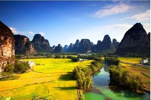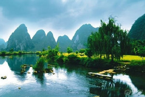 明仕河曲折盘旋,河两岸层峦阵列,或群峰竞秀,或峰林疏落,或平坦开阔,山青水秀,素有小桂林之称。坐上竹筏,顺流而下!田园山水之间皆是稻田,眼光所及皆是绿色。