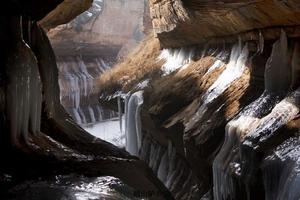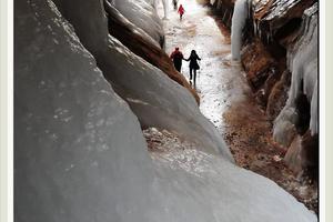 冰窟峡谷奇观——黑老锅,位于甘肃省庆阳市西峰区显胜乡毛寺村。峡谷幽长,怪石突兀,岩壁陡峭,崖壁黑里透红,红中夹黄,经过泉水冲刷后其状酷似烧饭的铁锅,故此得名黑老锅。黑老锅石峡长约千余米,乡亲们亲昵地称之“石峡”,里面隐藏着一座巨大的天然冰窟,冰窟由砂石层、黄土层和山泉水在寒冷冬天滴水成冰、顺势形成了冰洞和各种形状的冰景。令人鬼斧神工之奇的一线天地穴下,整个景观浑然天成,如同一座地下冰宫、天然冰库、黄土冰窖,是庆阳盆地黄土高坡上一道罕见的地貌奇观。