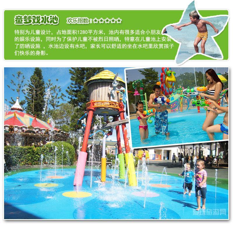 特别为儿童设计,占地面积1280平方米,池内有很多适合小朋友们的娱乐设施,同时为了保护儿童不被烈日照晒,特意在儿童池上安装了防晒设施 ,水池边设有水吧,家长可以舒适的坐在水吧里欣赏孩子们快乐的身影。