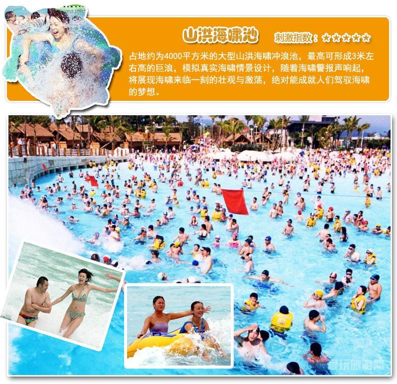-占地约为4000平方米的大型山洪海啸冲浪池,最高可形成3米左右高的巨浪,模拟真实海啸情景设计,随着海啸警报声响起,将展现海啸来临一刻的壮观与激荡,绝对能成就人们驾驭海啸的梦想。