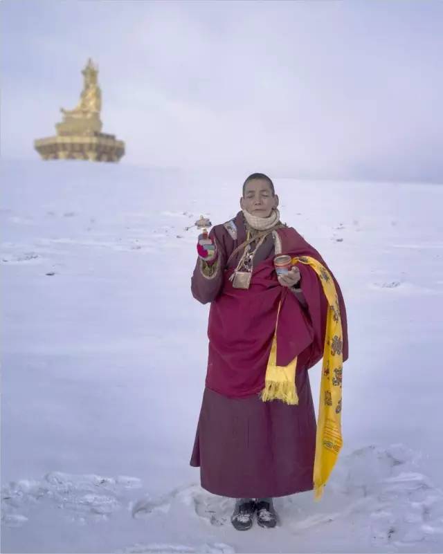 与众不同的是,她身着一身降红色的僧袍,手上握着一串佛珠。