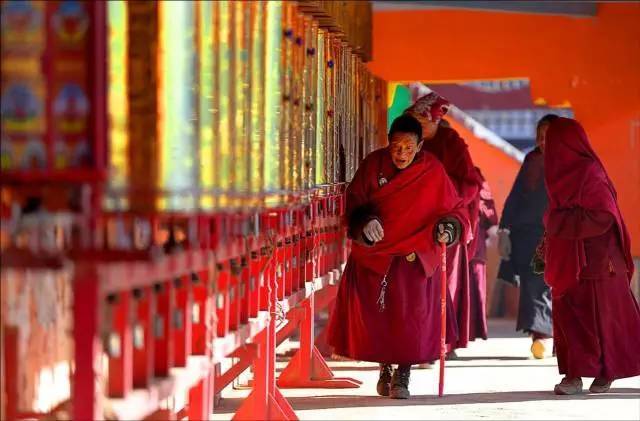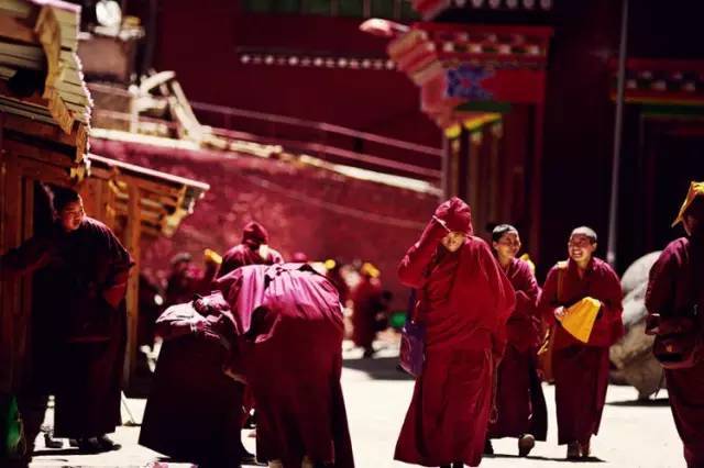 在路道上,身披桨红色僧袍的喇嘛和尼姑来来往往,每个人都是孤独的,因为漫长的修行路上,只能倾听自己内心的声音;然而他们又不是孤独的,因为身边都是如此孤独而虔诚的灵魂。