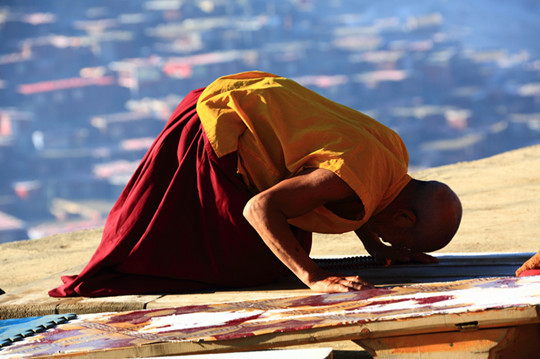 坛城边的空地上,永远有磕长头的虔诚信徒,学院还专门为此在1层平台上放置了木板。
