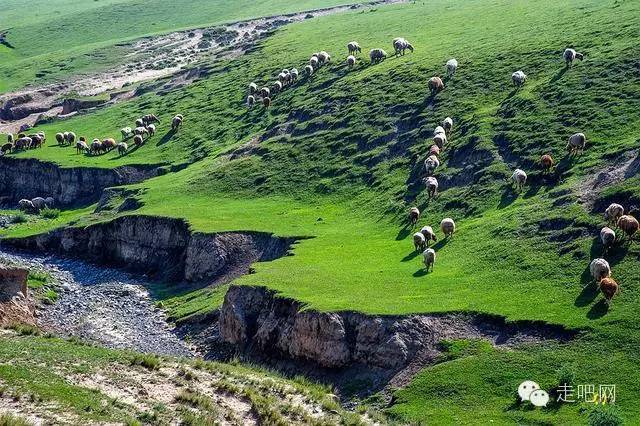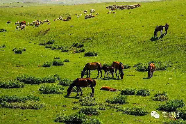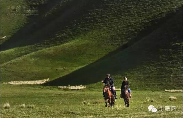 从三屯河煤矿岔口进入草原地带,这里的草原几乎是用绿毡子铺垫的,光滑的山脊,弯腰低头的牛羊和骏马,还有不时出现的哈萨克牧民和他们的毡房、废弃的石屋、羊圈。