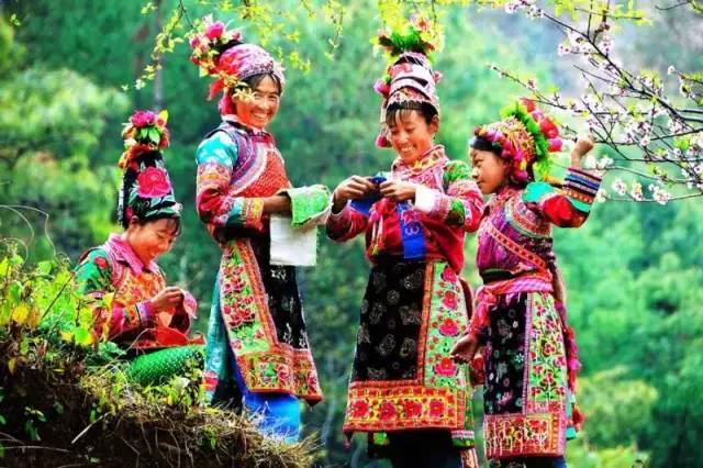 这里的山是绿色的,树是绿色的,连姑娘们的衣裳也离不开明晃晃的绿。高冠、红衣、绿裤,姑娘们大红配大绿的服饰,非但没有一丝丝“土”的感觉,反而成了青山绿水间最美的艳绿风情。