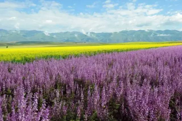 大片大片的黄,大片大片的紫,就这样一望无际地盛开在天山脚下,那花海,那色彩,就像普罗旺斯的薰衣草与向日葵般,绚丽而浪漫。