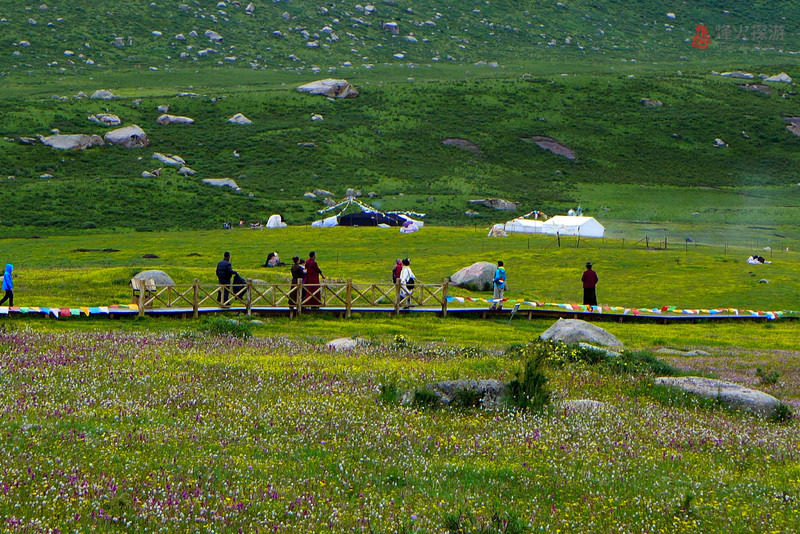 坐在车上,放眼望去,这里到处都是草原。走了几天也没走出广阔无边的大草原,草原上牛羊成群,随处可见,最近的羊群已走上公路,就在车前悠闲地走着。司机们都停下车来让牛群羊群先过马路。 而草原远处的牛羊群则像草原上盛开的朵朵小白花和小黑花。太多了,好像一会儿在这个坡头,一会儿又在那个坡头,其实是牛羊群太多的缘故,但我发现牧羊人很少,偶尔会碰见他们骑着马限随在羊群牛群后面。草原上还有各色不知名的小花,很多很美。我们的领队拍客叔叔说:“这些不知名的小花都叫格桑花。”多美丽的名字呀!