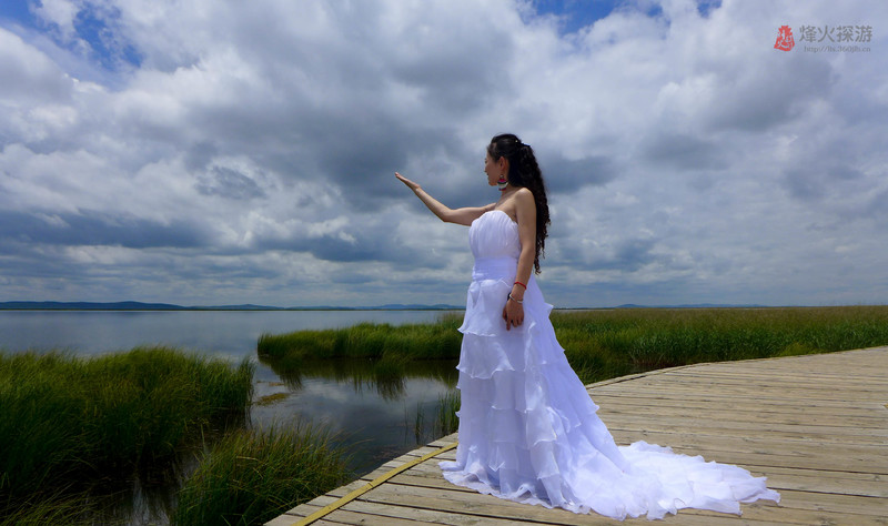 我们游览的第一站是尕海,草原之中有一条清亮的湖,我们走在草原之中的木板小路上抬头望天空。啊!天太蓝了、云太白了,而且云朵离地面很低,低得可以用手抓住,我真想撕一片云朵带回家。第二天还去了“花湖”,我猜大家都会想到花湖肯定是花的天堂,蜂的乐园。其实不是,它是红军当年走过的草地,应该说是沼泽地。新绿欲滴的草映在浅水里,水中的各种鸟儿一会儿跳跃戏水,一会展翅低飞,太美了。妈妈她们还在那里拍了婚纱照,是领队带的婚纱,我想妈妈和阿姨们觉得这里太美了,所以都轮流穿婚纱拍照,不过就是美,美的天人合一呀!