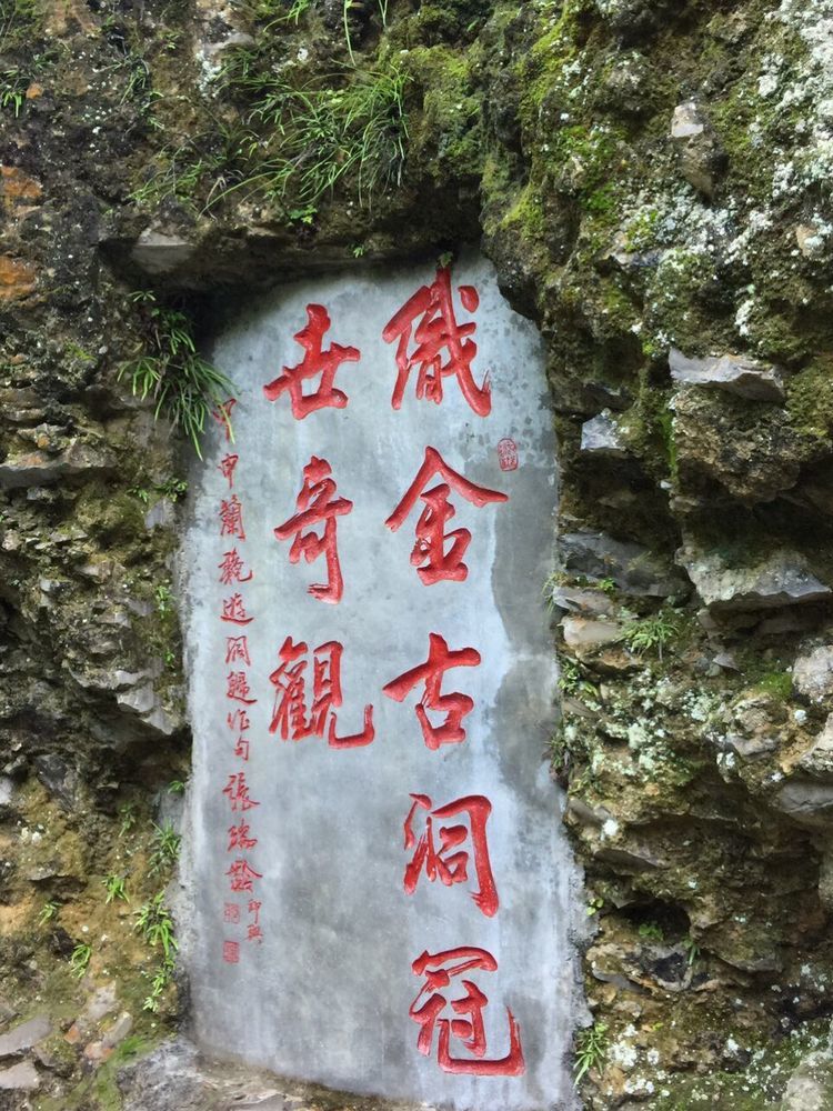 "游过织金洞,方知溶洞奇。地下看世界,洞中别有天",在前往入口的岩壁上,刻有很多名人的题词。