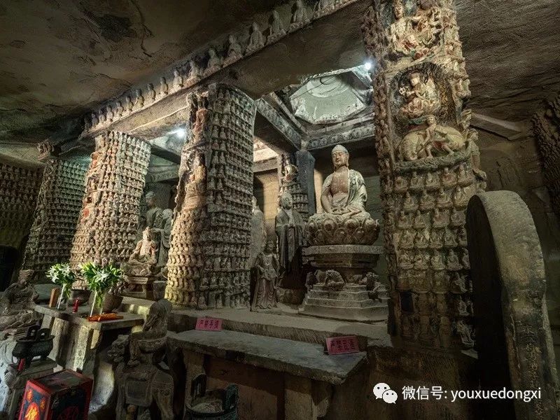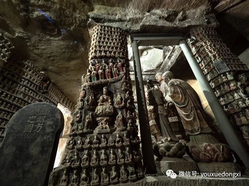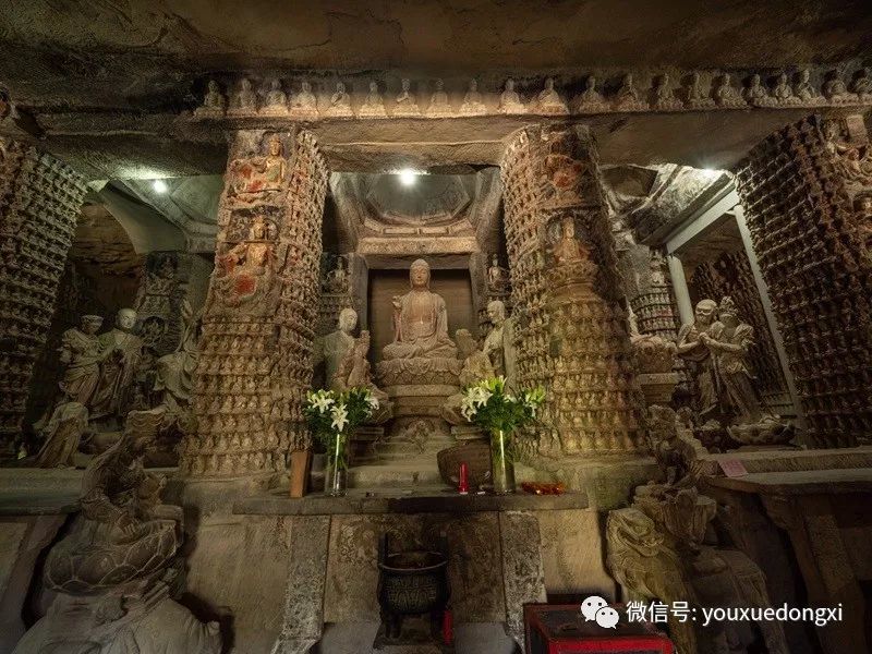 主窟万佛岩呈长方形,面积为225平方米,平顶八卦莲花藻井,窟内正中有长11米,宽5.3米,高1.4米的石坛基,坛基上有3组14尊大型主体石雕,主佛像为释迦牟尼三世佛,而自在观音和地藏菩萨也是重要题材,可以看出当时人们主要崇拜的对象。主尊释迦牟尼佛结跏跌坐,坐于束腰仰莲须弥座上,右手施说法印。坛前有乘狮的文殊菩萨和乘白象的普贤菩萨,左右分别侍立迦叶和阿难,均脚踏莲座,形象逼真而生动。坛基东西两端各立一尊菩萨,坛基前后两排共八根接地连顶的方形石柱,系造窟时所留支撑顶板岩石。石柱四周和石窟四壁均密无间隙地刻满了数层浮雕,以佛教故事为主。到了明代万历年间,主窟的外壁上又被精雕了道教老子及关帝的造像,清代儒教盛行,又将孔子的造像补雕其上,从而使这一珍贵的艺术宝库呈现出佛、道、儒三教合一的形态。当然关于孔子雕像也是有争议的,我们现场参观时,就听到不知哪一级的文物部门专家说,根据龛像上方的题记及图像特点,说孔圣人像牵强,倒更像是居士像甚至是游人留像。龛上方题记是一首诗,“霁雪山程远,寒云石洞深。汲泉怜老衲,一酌洗尘心”,图像是老者长须,头戴帽,手握佛珠,旁立侍者。究竟是谁?智者见智吧。