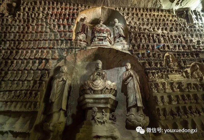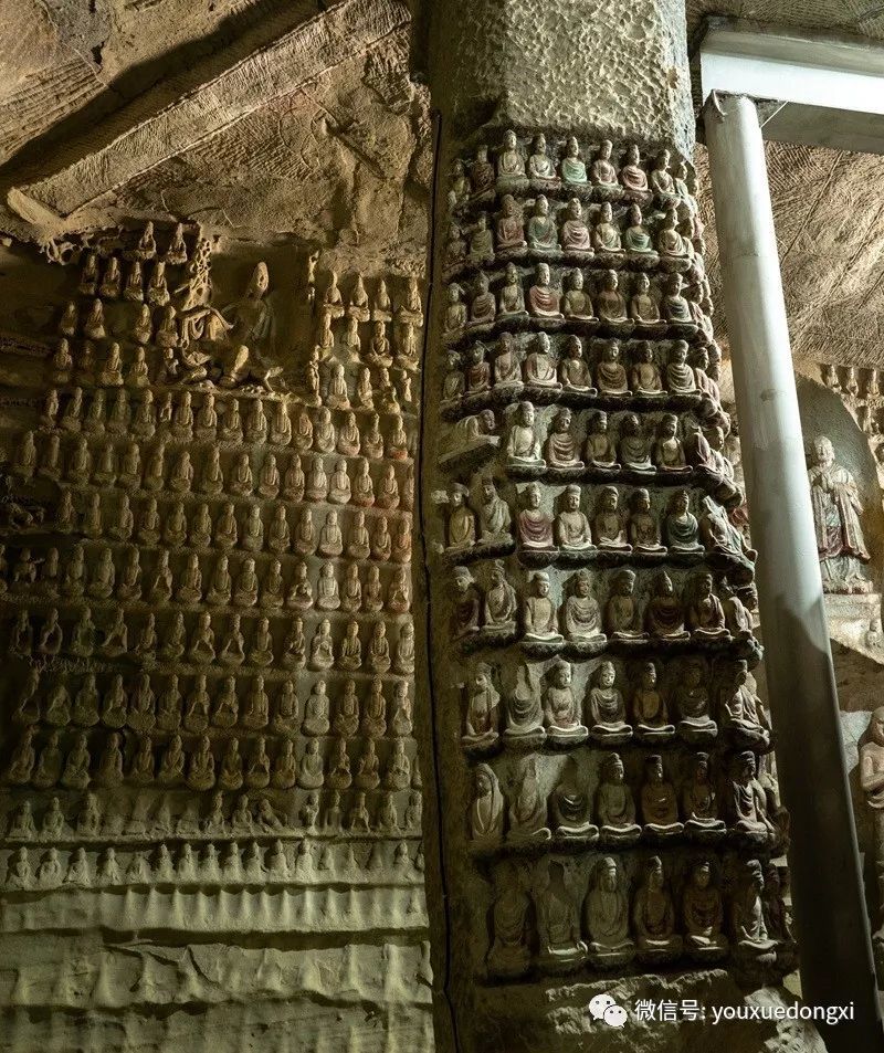 据资料称,钟山石窟又名万佛岩、普济寺、大普济禅寺、石宫寺等,始建于晋太和年间(公元366-370),历经唐、宋、金、元、明、清等千余年凿建而成。对照历史年表,这段时间显然是属于前秦政权一统北方时期,所以建于东晋的说法不知所谓,提出来请教方家。不过发掘的5个石窟中,3号窟是值得一看再看的。我们去时恰好县文物部门招待北京大员,跟着沾了一光,拍下了很多精美的塑像。窟内有大小佛像万余尊,故称万佛岩,始建于宋平治四年,其内部富丽堂皇,色彩鲜艳,刻满了四壁的万佛及菩萨、罗汉等造像,姿态神情无一重复,使人如闻其声,如临其境,成为不可多得的稀世佳作。中外学者认为,其历史价值,艺术价值不在云冈石窟、龙门石窟、敦煌莫高窟之下,专家结论为"中国最早的石窟群"及"第二个敦煌"。