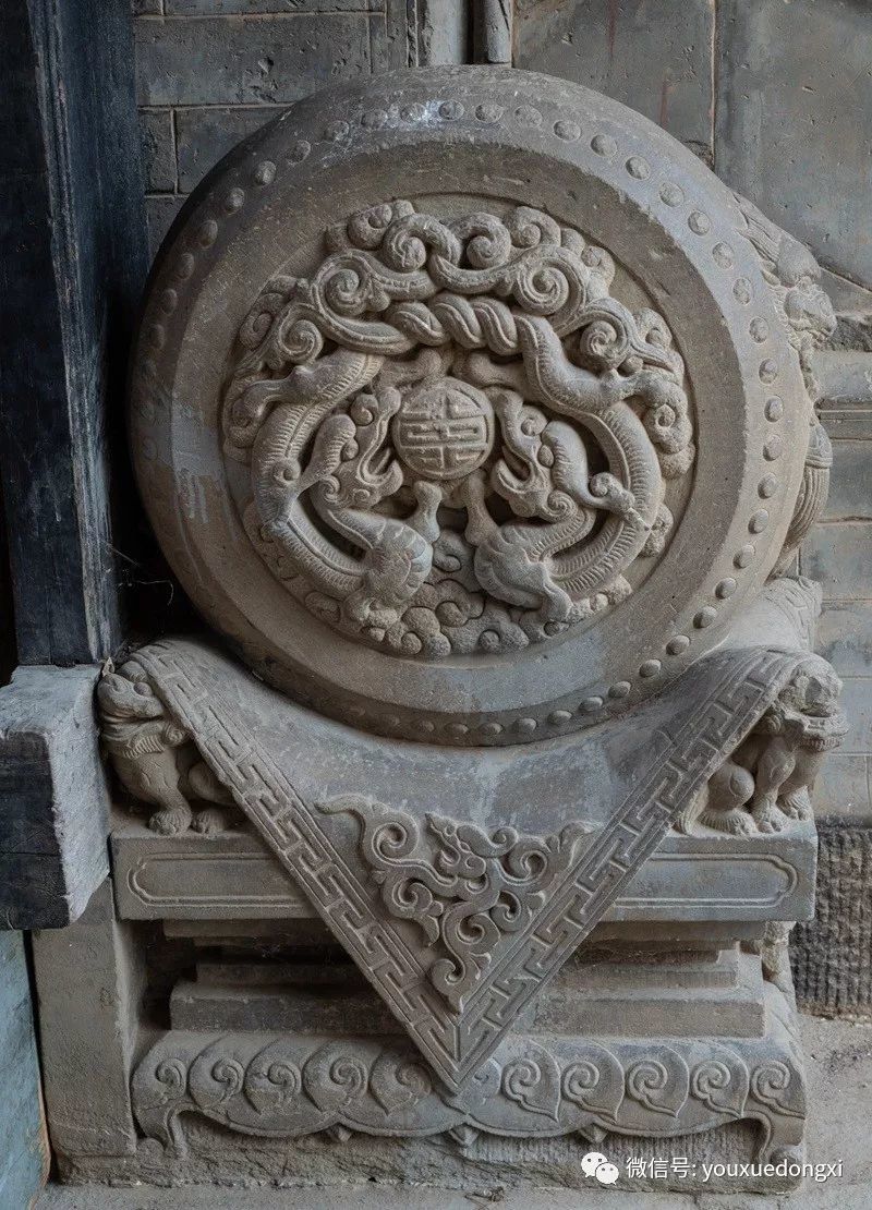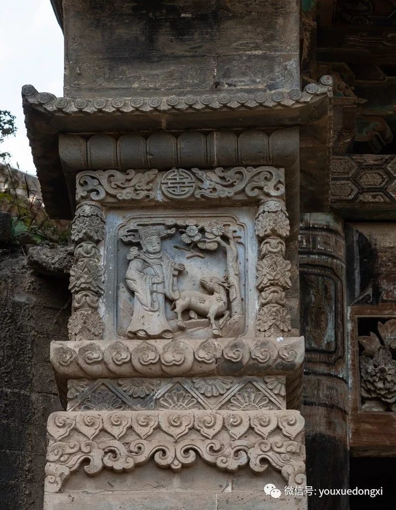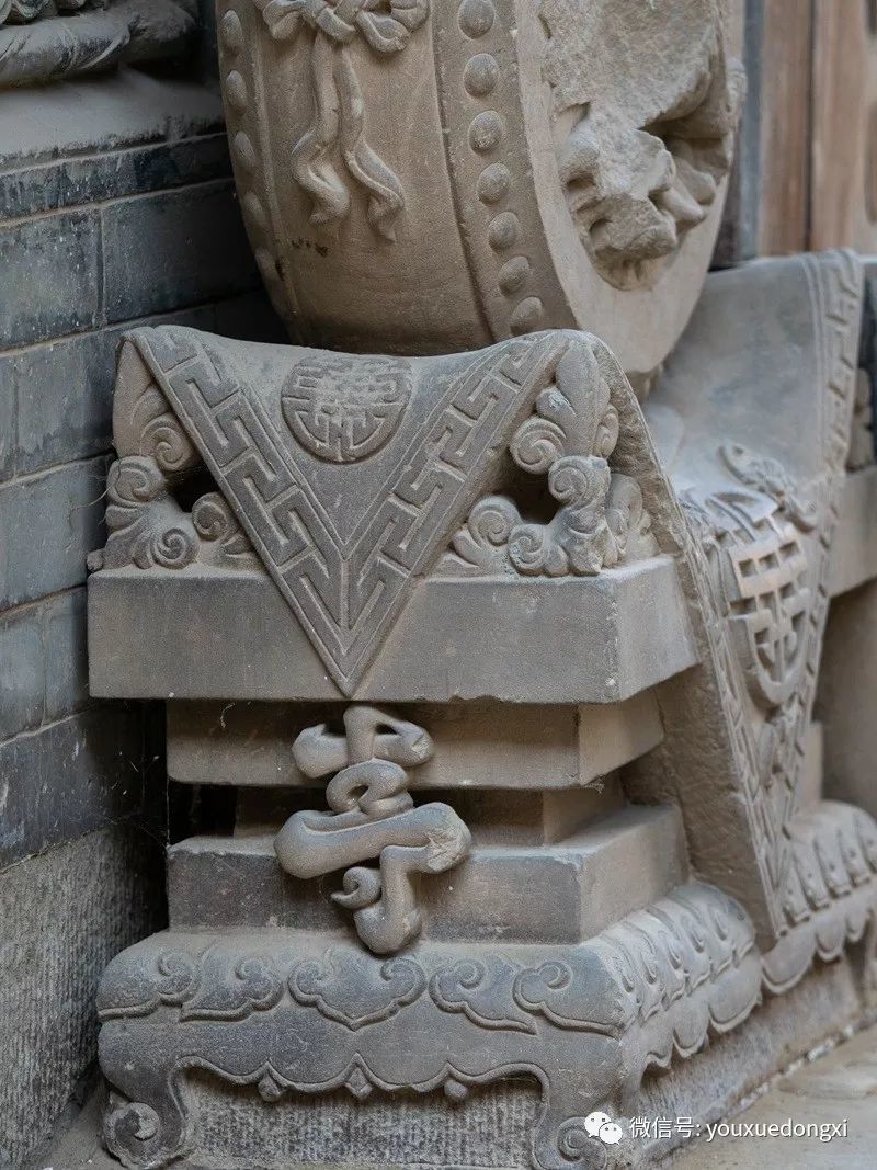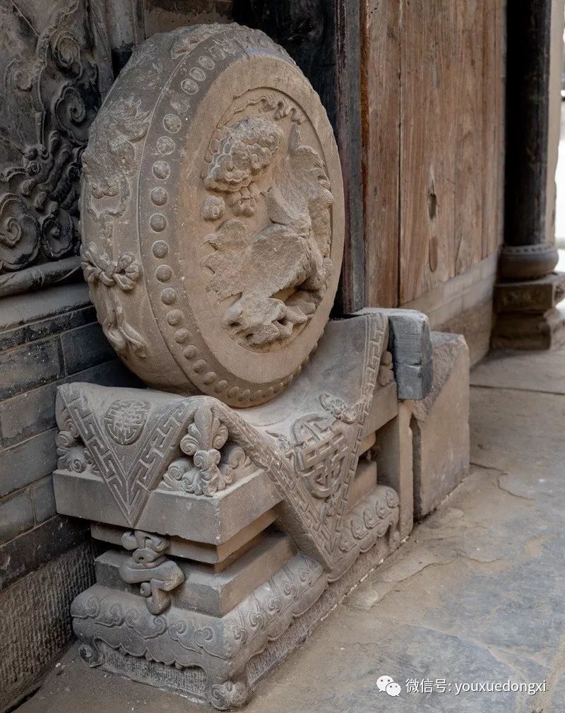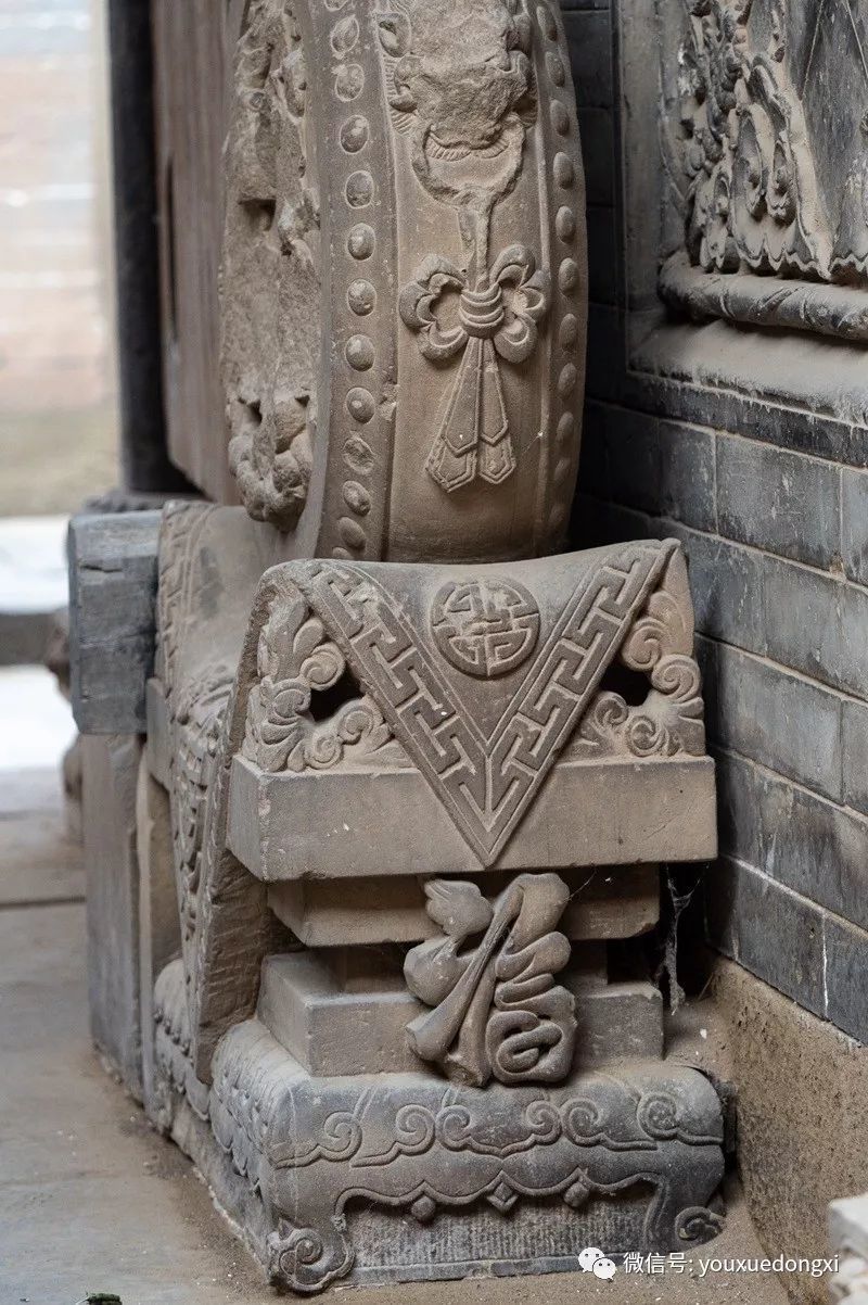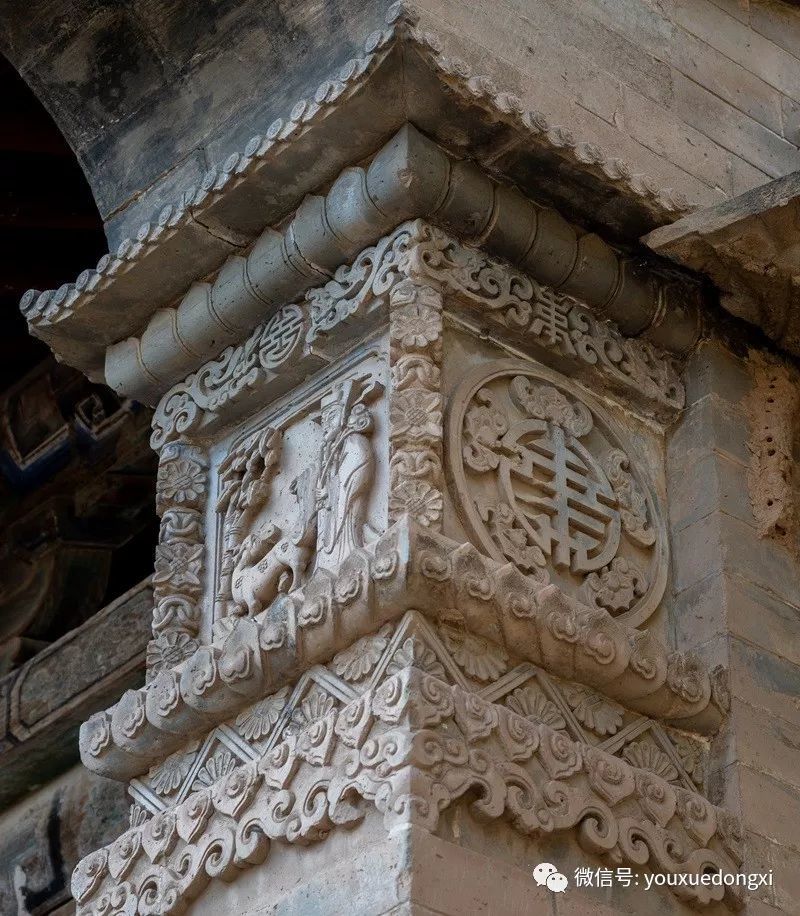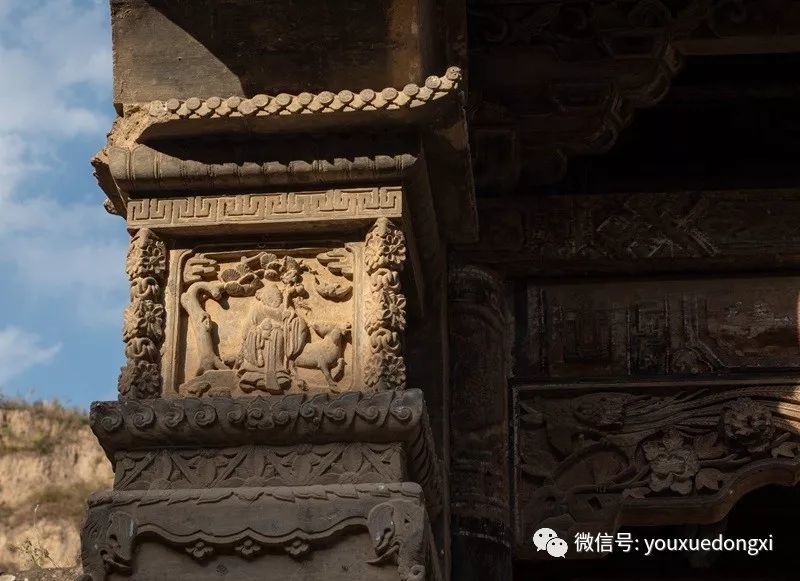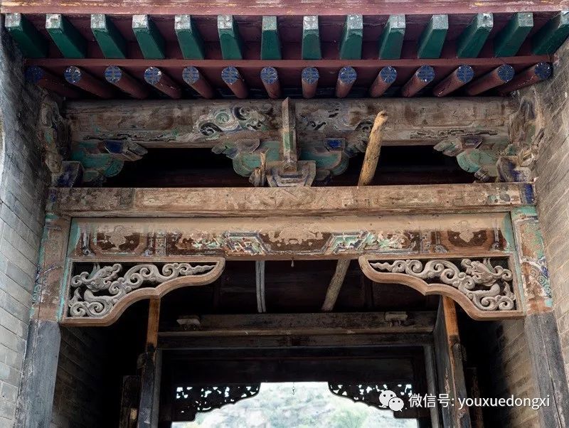 进得山门,盘旋而上,下院、中院、上院层层叠嶂,院外石路相连,院内暗道互通,仿佛进入一座堡垒迷宫。院中砖雕、木雕、石雕无处不在,巧夺天工,礼仪、防卫、美观、实用兼顾,堪称一绝。下院是陕北典型的窑洞四合院,硬山式大门制作精细,上悬“大夫第”匾额,标榜出主人士大夫的身份和家庭的显赫。中院大门为五脊六兽硬山顶,门楣木匾上书“武魁”二字,气势夺人,以炫耀主人叔父武举之荣。入门后东西厢房对置,主人用于待客和社交活动,即便马棚也十分阔绰,石壁上隐藏着的一排排拴马石扣,彰显了主人的巧思和豪气。拾阶而上至上院,便是内宅,正面为垂花门,青瓦卷棚顶,四柱双层门,雀替、门楣等制作华丽。进入垂花门是陕北地区最高等级的“明五、暗四、六厢窑”式窑洞院落,开合舒展,错落有致,穿廊抱厦,十字砖墙,东西对称,窑洞窗棂雕刻精美,无有一处重复。院后高墙,天造城垣。除以院落,全为粮仓。一个粮仓存粮50石,十余个粮仓暗藏各处,即便内里人也难知底细。乡人依稀记得,每逢荒年,姜耀祖就会主动开仓放粮,接济贫困之余,也赢得了声望。这和院落中随处可见的被刻在木匾等处的诗书礼仪箴言相辅相成,体现了主人的远见和追求。