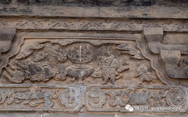 石窟艺术起自西晋,盛行数百年,至宋代已始衰落。而钟山到宋代却更为兴盛,它不但继承了唐代雕刻丰满圆润的写实风格,而且在造型上更注重人物内心世界的刻画,是我国雕刻艺术的一大飞跃,成为北宋石雕艺术的代表作。该窟中央佛坛上三尊大佛平静含蓄的脸庞上浮现出的一缕似有还无的笑意,便是代表。受到佛教世俗化、民间化的影响,对罗汉、天王、弟子等形象的刻画则更加接近现实,正如有专家在评价陕北石窟造像时所言,“如果说佛陀与菩萨还是仙界风貌,那么罗汉之类的雕塑则是有血有肉有个性的现实生活中的陕北大汉”。又如东壁雕刻一铺释迦佛涅槃升天图,有趣的是在涅槃佛的头部升起一朵祥云,祥云上端坐着一尊小佛像。据学者考证,这是受到中国传统升天思想的影响,表现的是释迦佛寂灭之后,灵魂升入天界。显然,这也是佛教中国化、世俗化的产物,是下层民众对佛教涅槃思想的朴素理解。