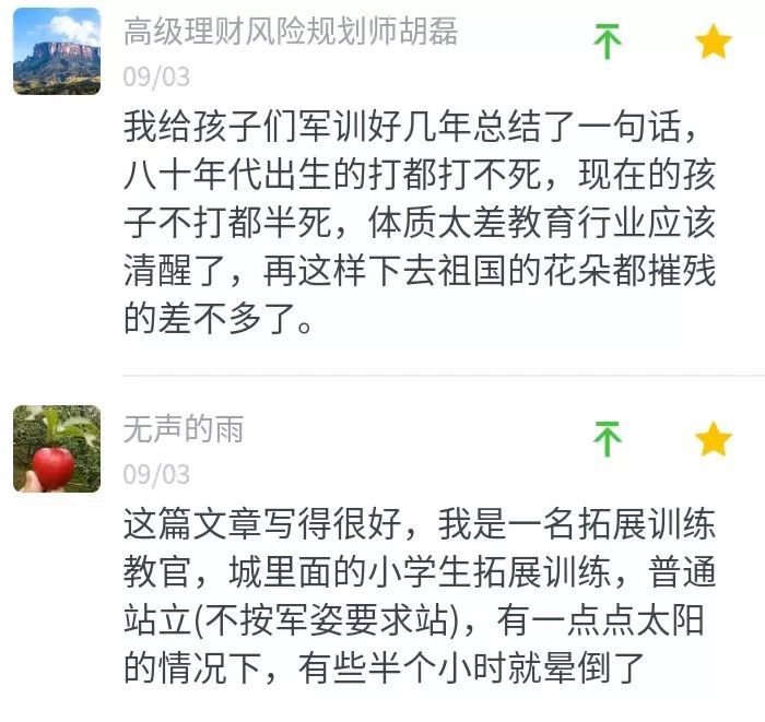 有位两位军训教官在之前的文章留言说:80年代的人打都打不死,现在的孩子不打都半死,站在不大的太阳下,有的人半小时都撑不住就晕倒了。这样的体质怎能不让人忧心?