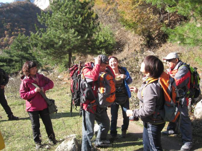 言归正传。今天出行的领队是:骊山拍客;协助是:寒雨、吃鱼不说话、郁郁葱葱、水宿山行。共有27人报名参加,出动交通工具2辆(驴友会提供一辆26座中巴、寒雨的朋友提供一辆捷达)。早6:50分在东广场集合,7:10分出发,一路非常顺利,于9:40分安全到达付家村,9:50分进山开始徒步。在去的途中最担心的就是害怕下雨,直到今天早上查看天气预报还是小到中雨!好在老天着实很给面子,虽着进山逐渐深远,天气慢慢转好,居然露出阳光又见蓝天白云!