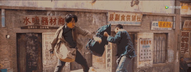 到了白天,画面从招待所转到了街头,大红标语、二八大杠自行车、街边的小吃摊子,
