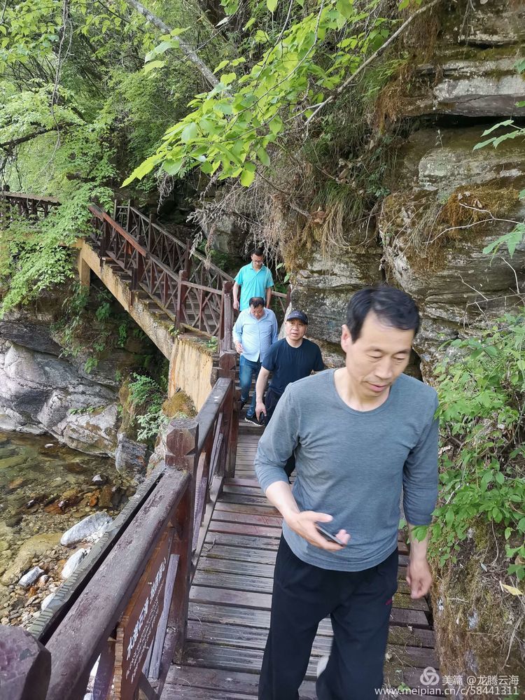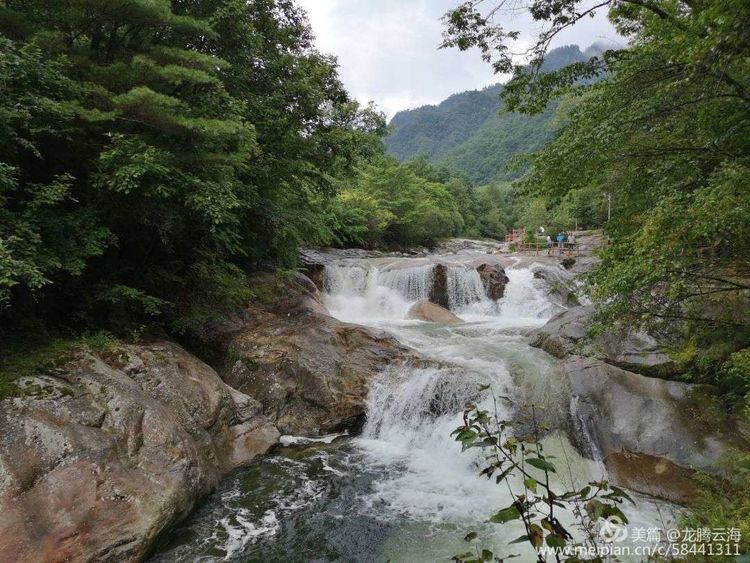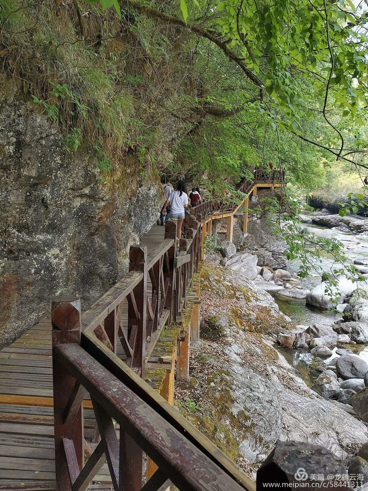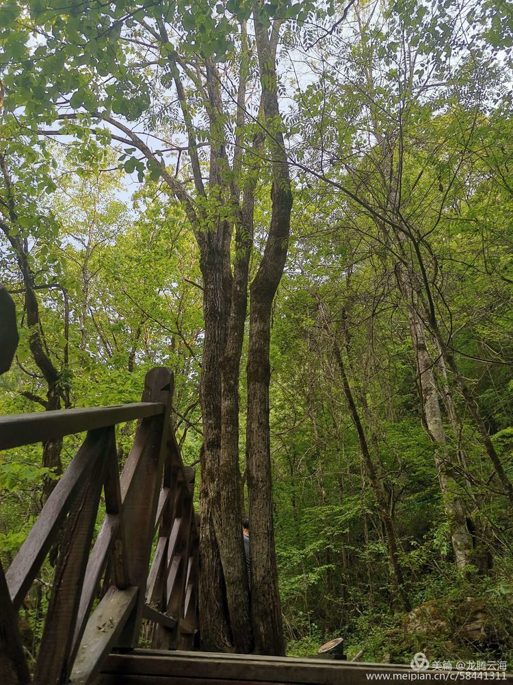 从水帘洞到三叠瀑,奇石悬崖,古木参天,清流环绕,竹影婆娑,细水潺潺,山花潋滟,莺叫蝉鸣。有的古树一枝独尊,有的三五相抱,七八拥簇如同佛手。古树青苔斑驳,藤蔓缠绕,一径黄木栈道徐徐引人入胜,真可谓一步一景,景景不同;山重水复,柳暗花明;处处入画,处处留影。“此景只因天上有,我自逍遥仙境游”,
