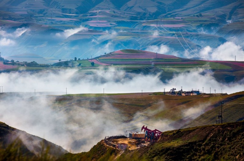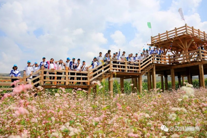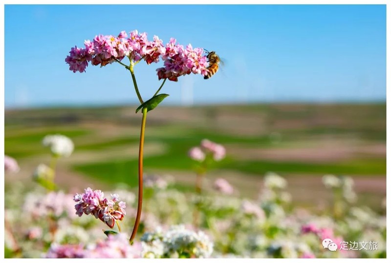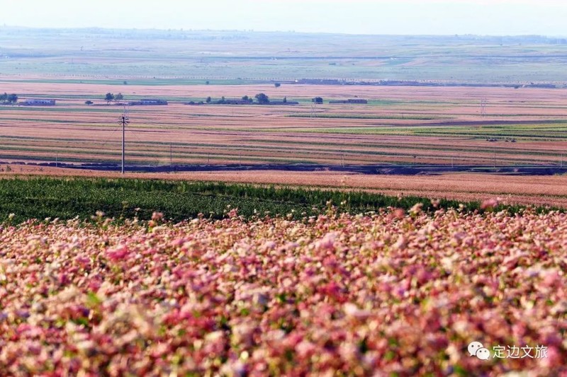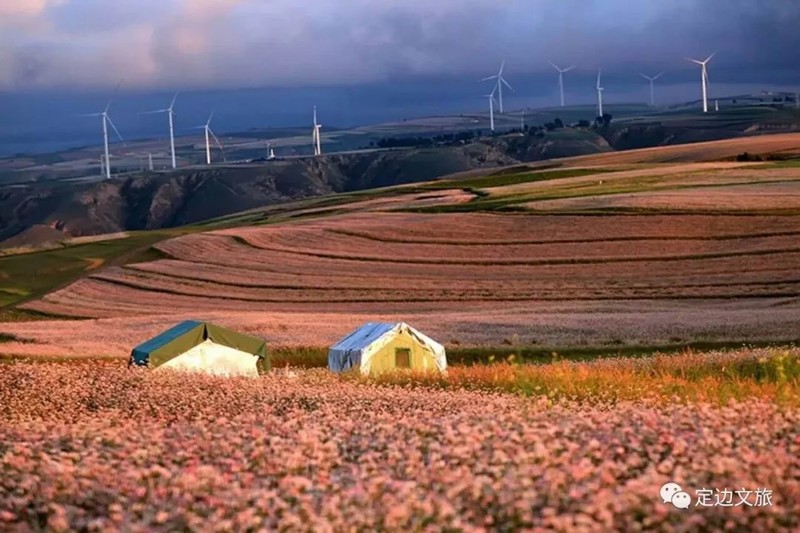 每年八、九月,正是定边一年中风光最美的季节,这时荞麦花、油菜花、洋芋花、胡麻花、向日葵花竞相开放、争奇斗艳,红的、黄的、白的、粉的、紫的、绿的五颜六色、异彩纷呈,起伏跌宕,连绵百里,形成万亩花海。一个个梁塬涧台之上,窑洞人家、风车井架、烽台古堡,在蓝天白云的映衬下,呈现出一幅幅五彩缤纷的瑰丽画卷,令人目不暇接,流连忘返。