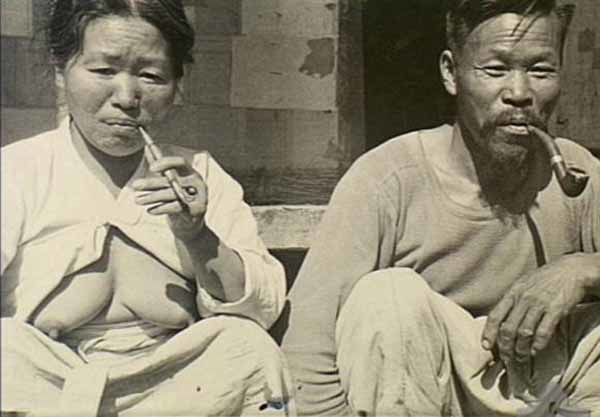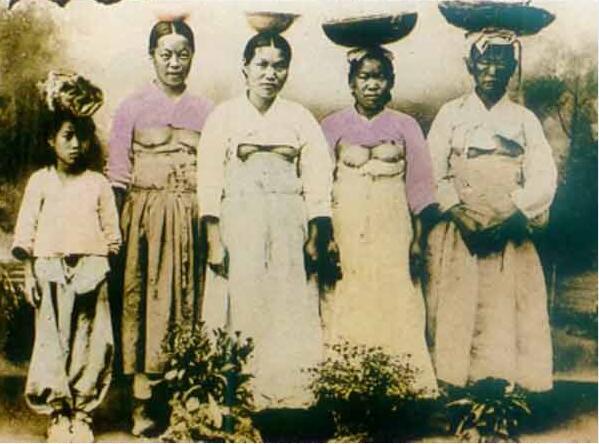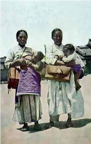 1894年甲午战争前夕,淮军将领聂士成曾奉李鸿章之命,率武备学堂学生考察东三省,并游历俄国滨海州和朝鲜北部。在他随后写的《东游纪程》提到“朝鲜风俗,男女有别,所最陋者,冬夏皆赤足,男子著麻鞋;妇人裳大衣小,生子辄露乳于外,严寒不顾。”日本殖民统治时虽努力取缔,但很难禁绝,朝鲜战争爆发,美军仁川登陆时,仍能见到这样的装扮。今之韩国视这种露乳装为奇耻大辱,但是,仍不能隐瞒修改历史,中国人旧时也有陋习,如太监,小脚等!