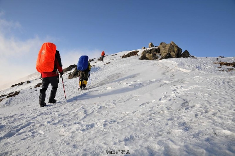 3、防风外层:冬日鳌山的外层服装防风要求远比防水性能重要的多,风寒效应之下的硬壳可能瞬间就成为一张薄皮,而WS面料的软壳在这点上会更加的合适。还有冬日穿越一件300克以上650F的羽绒服必不可少,营地休息时再外套一条羽绒裤才足以抵挡鳌山之上可怕的寒冷,有记载的数据显示鳌山极限温度到过-49度,有时候白天都能瞬间降温,而且来势极快,只有迅速添置保暖层并采取防风措施,才能有效避免失温。