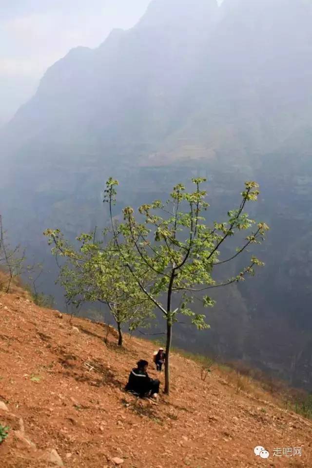 村口的大树,绿荫如盖,站在树下,可以俯瞰金口河大峡谷,奔涌的大渡河如一条碧蓝的玉带,春天对面山壁上野桃花盛开,千米绝壁一点,红美极了。