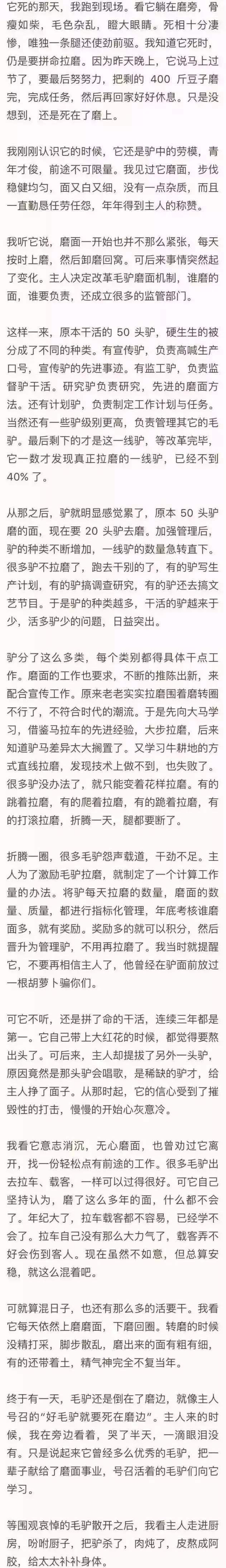 最近,一篇据说是获得了“2016年机关单位论文大赛一等奖”的文章——《卸磨杀驴》火爆网络。细读之后,其中意义值得品味……单位无论大小,实施改革顺应大势乃理所当然,但如考虑不周,分配失衡,以致抬头争食的驴越来越多,埋头拉磨的驴越来越少,就得不偿失了。