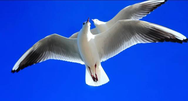 在这张照片中,颜色的对比使得两只鸟的轮廓、动作更加明显,由于天空明亮的蓝色与鸟身上明亮的白颜色相结合,摄影师才能创作出这幅作品。