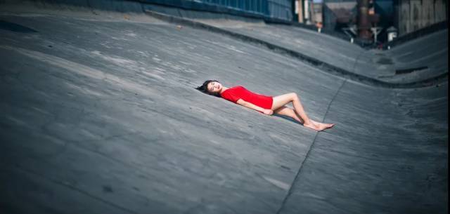 在这张照片中,红衣女孩躺于灰调的水泥地上之上,打破了画面的整体,增添了画面的视觉冲击力。占据支配地位的大片的灰调中,红色起到了平衡的作用。