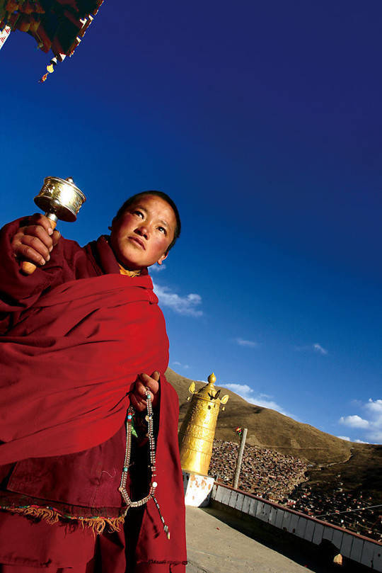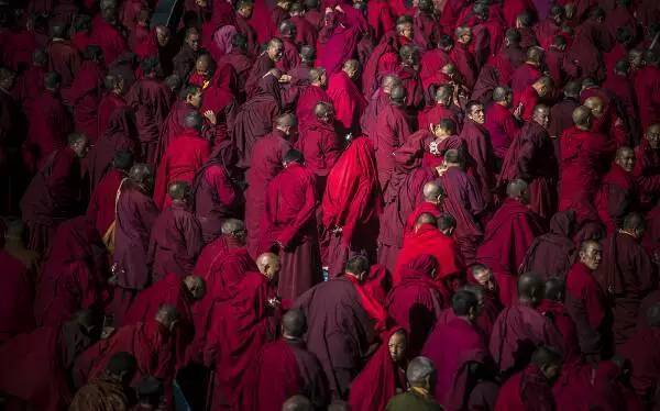 在路道上,身披桨红色僧袍的喇嘛和尼姑来来往往,每个人都是孤独的,因为漫长的修行路上,只能倾听自己内心的声音;然而他们又不是孤独的,因为身边都是如此孤独而虔诚的灵魂。