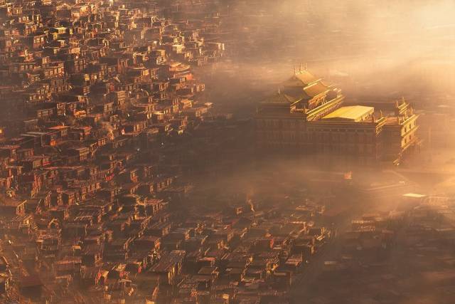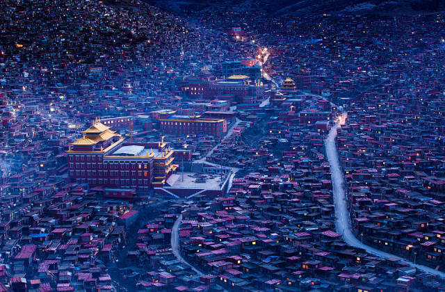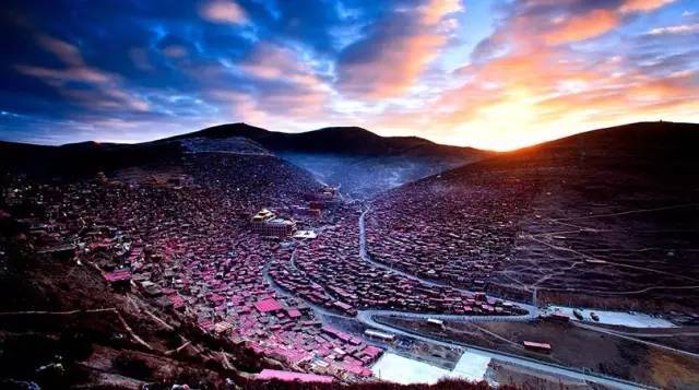 色达的黄昏很漫长,每天日暮时分,中国大部分地方开始夜幕降临,而它却依然闪耀着万丈光芒。褐红色的房屋,金色的佛塔,在阳光的映射下,哪怕只是看一眼,便能捕捉到永恒。