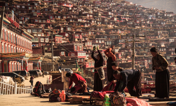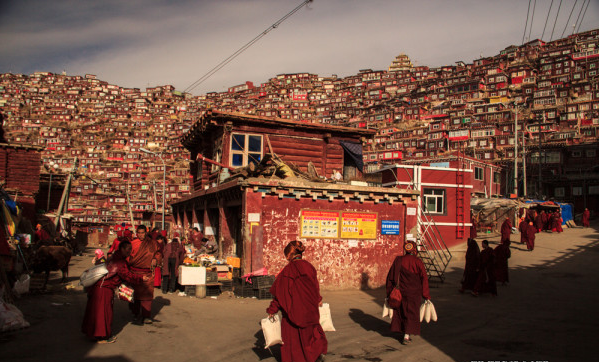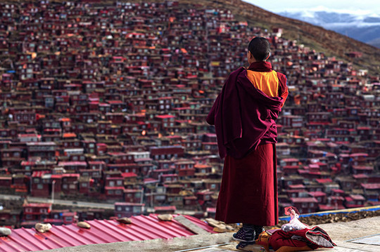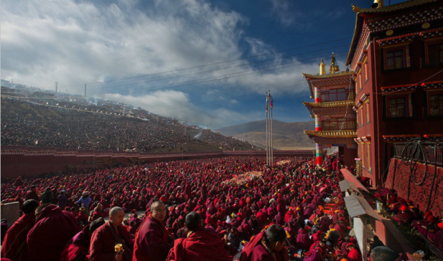 最初,在这个青藏高原上近乎与世隔绝的不毛之地,9000多位男女僧侣为自己的信仰建立了一个新的家园。他们在此聆听他们不参政的精神领袖晋美彭措对他们的教诲。到2001年,另外1000多汉族人也来到此地,并把喇荣五明佛学院定义为他们心中的圣地。