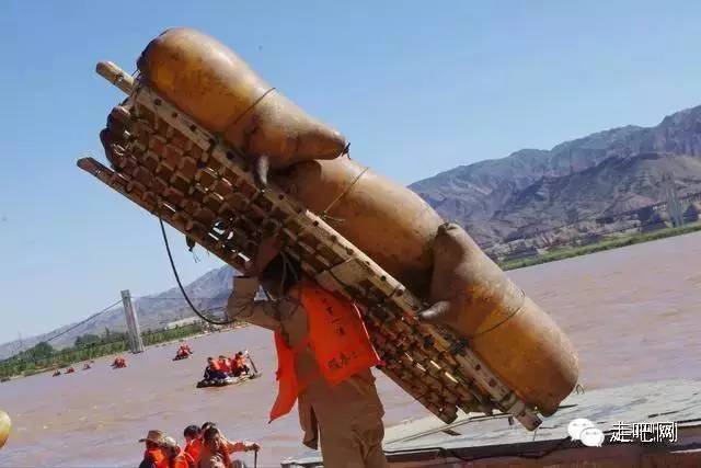 这种羊皮筏俗称“排子”,是将山羊割去头蹄,然后将囫囵脱下的羊皮, 扎口,用时以嘴吹气,使之鼓起,十几个“浑脱”制成的“排子”,一 个人就能扛起,非常轻便。乘羊皮筏子渡黄河有一种很穿越的赶脚;